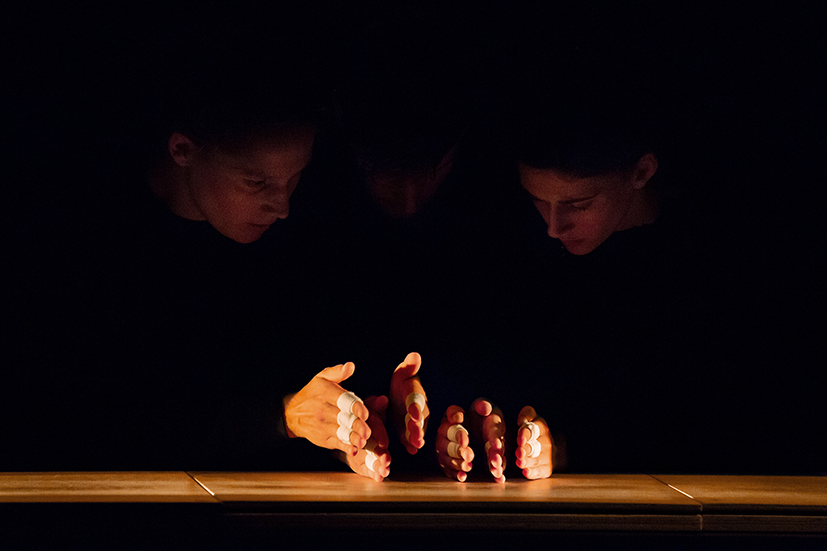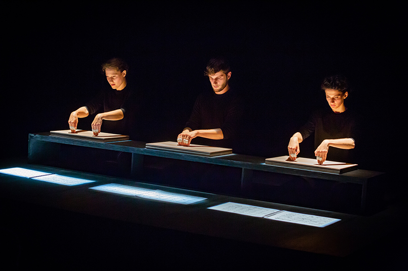 Parallèlement à l’école du Théâtre national de Strasbourg dont ils sont issus, Éléonore Auzou-Connes, Emma Liégeois et Romain Pageard se passionnent pour Musique de tables du compositeur Thierry de Mey. Point de rencontre entre deux disciplines, la musique et la danse, cette partition fonde leur travail. Son potentiel théâtral est au centre de leur recherche.